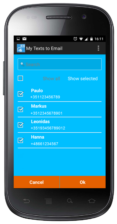 - Messages from selected contacts having specific words. etc